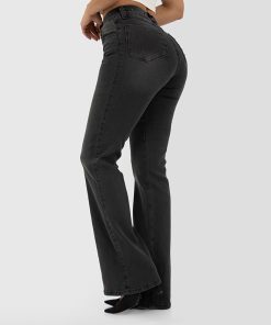 Jeans de tiro alto con trabillas y cuatro bolsillos. Efecto lavado. Bajo acabado cropped flare. Cierre frontal con cremallera y botón metálico.
